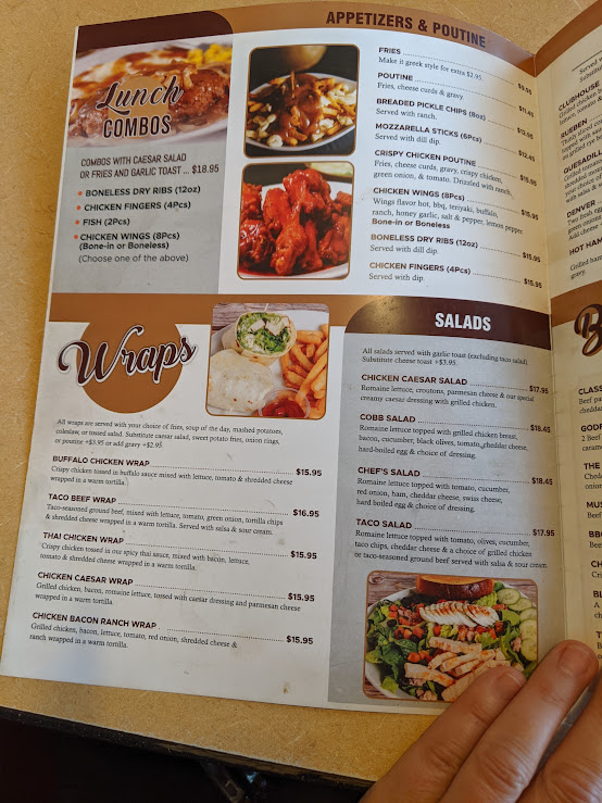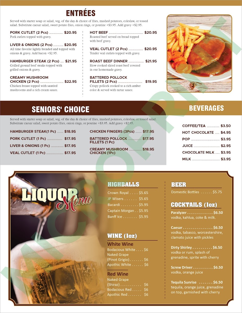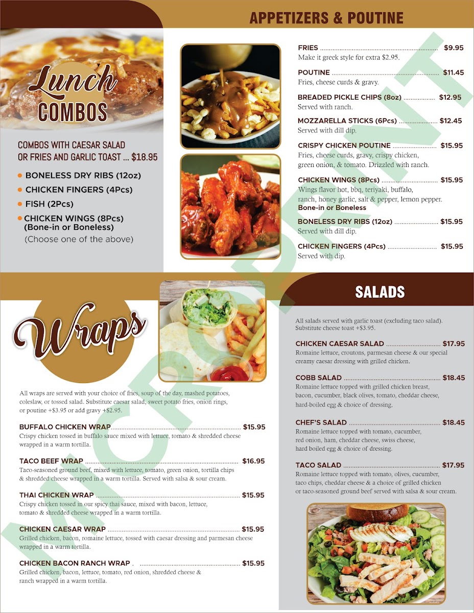 The menu at Prairie Oasis Family Restaurant offers a variety of options primarily focused on breakfast and hearty family-style meals. Visitors can find classic breakfast dishes, including egg and meat combinations served with toast and hashbrowns, as well as specialty items such as breakfast quesadillas and omelettes. The menu also includes a selection of pizzas, sandwiches, salads, and comfort food options like chicken poutine and homemade chili.